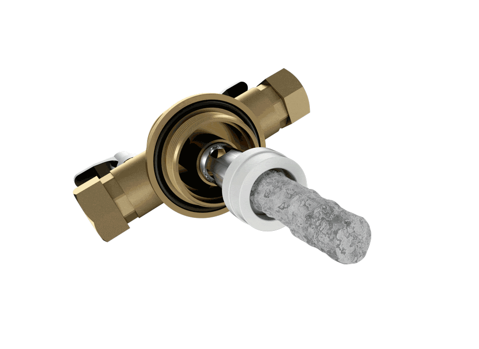 Nach dem das Wasser entsalzt ist, wird die Patrone entfernt. Die Anodeneinheit wird eingesetzt. Eine elektrochemische Reaktion zwischen einer speziellen Opferanode und dem Tank bindet korrosive und saure Gase. Gleichzeitig stabilisiert dieser Vorgang den pH-Wert des Systemwassers.